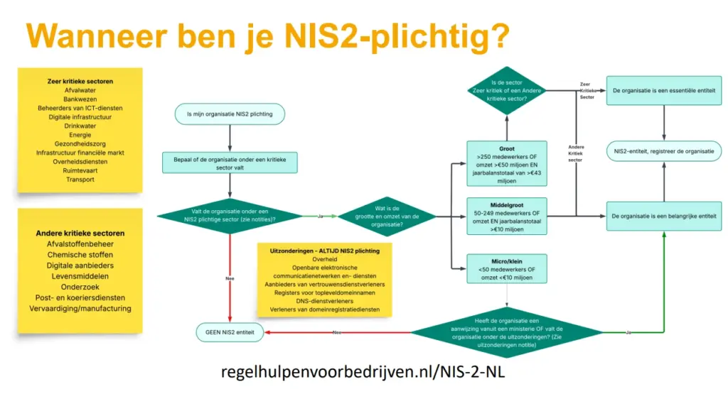 Bedrijven zijn NIS2-plichting indien ze in de kritieke sectoren werkzaam zijn en >50 medewerkers in dienst hebben of een omzet én totaalbalans van 10 miljoen hebben. In onderstaand stroomschema zijn de kritieke sectoren weergegeven.